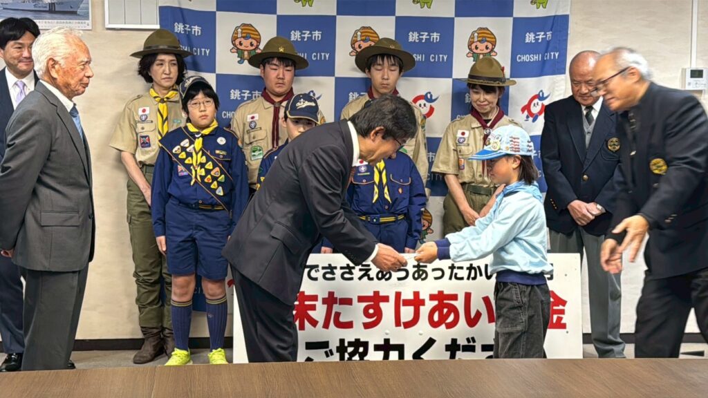 集まった募金を銚子市長にしっかり渡せているね(*^_^*)カッコいい