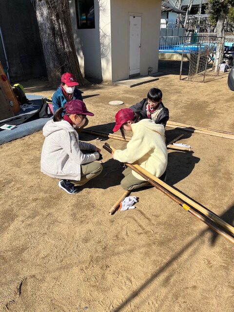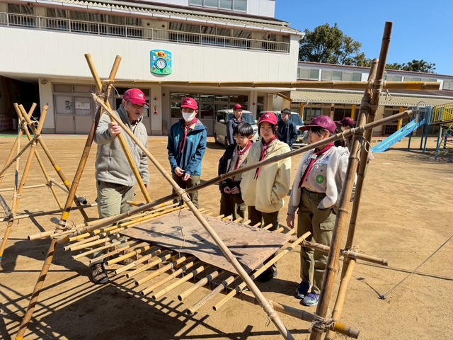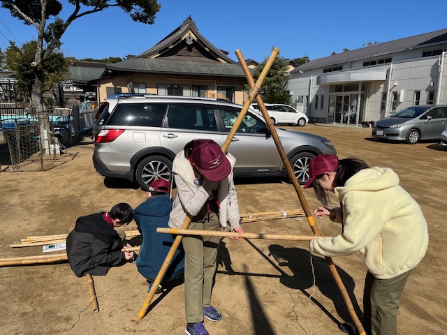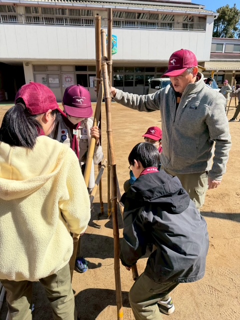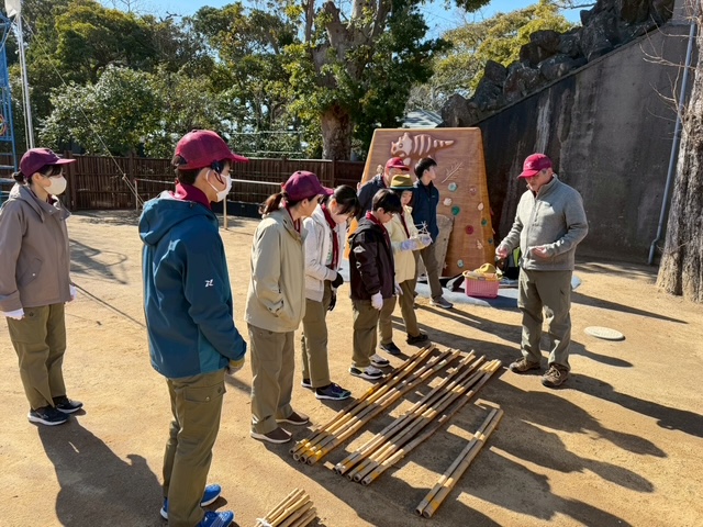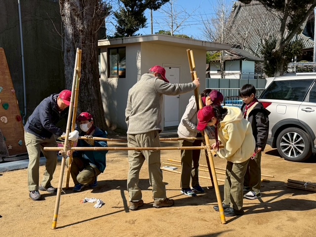 5月のキャンプに向けて、竹材を使った「立ちかまど」づくりに取り組みました。 この日のために竹材の組み方を学び、ロープ技能訓練を重ね、結び方や固定の仕方を一つひとつ身につけてきました。