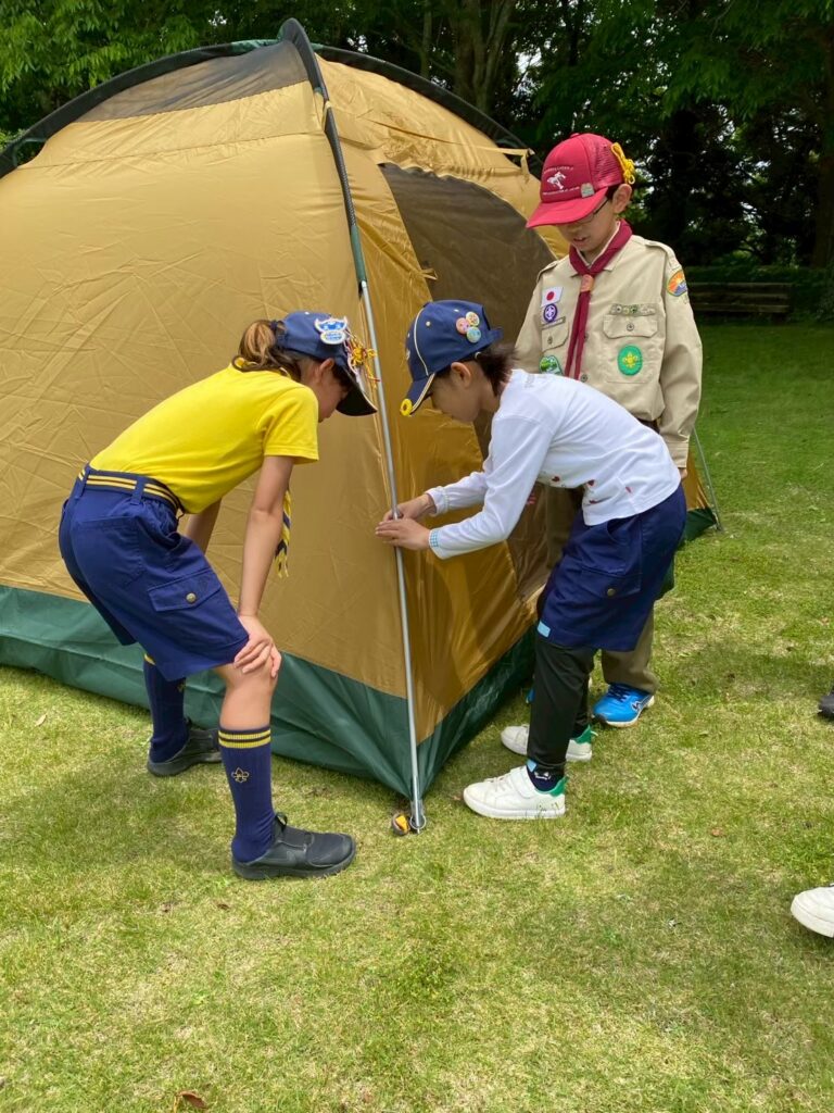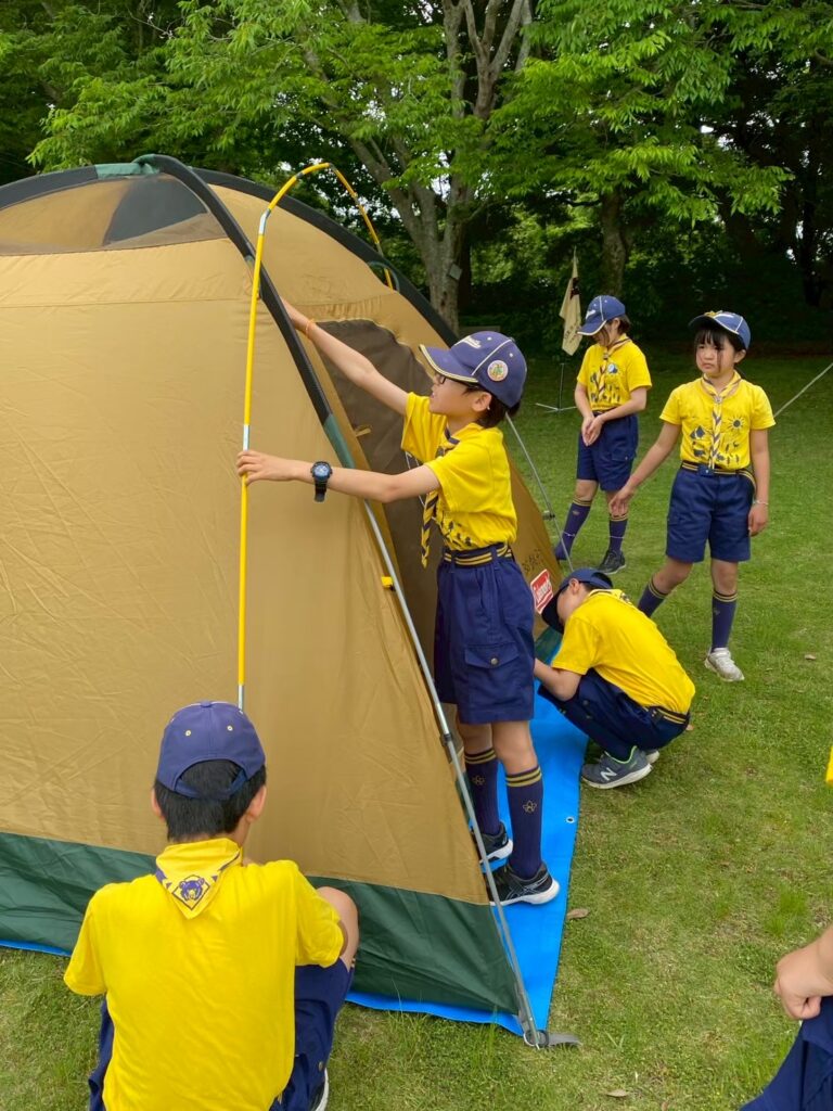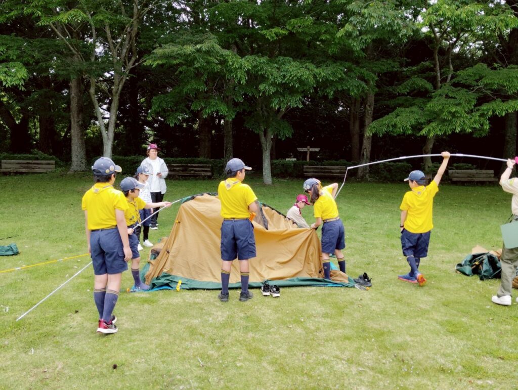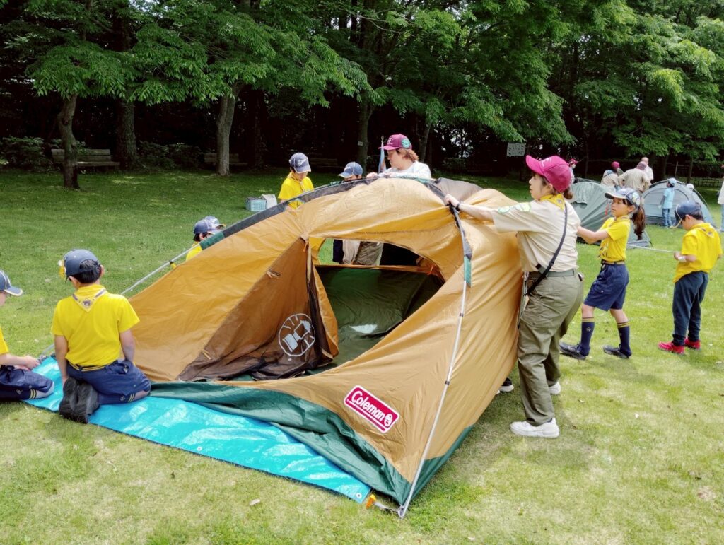 入隊式の後は、早速みんなで基地となるテントを設営しました。