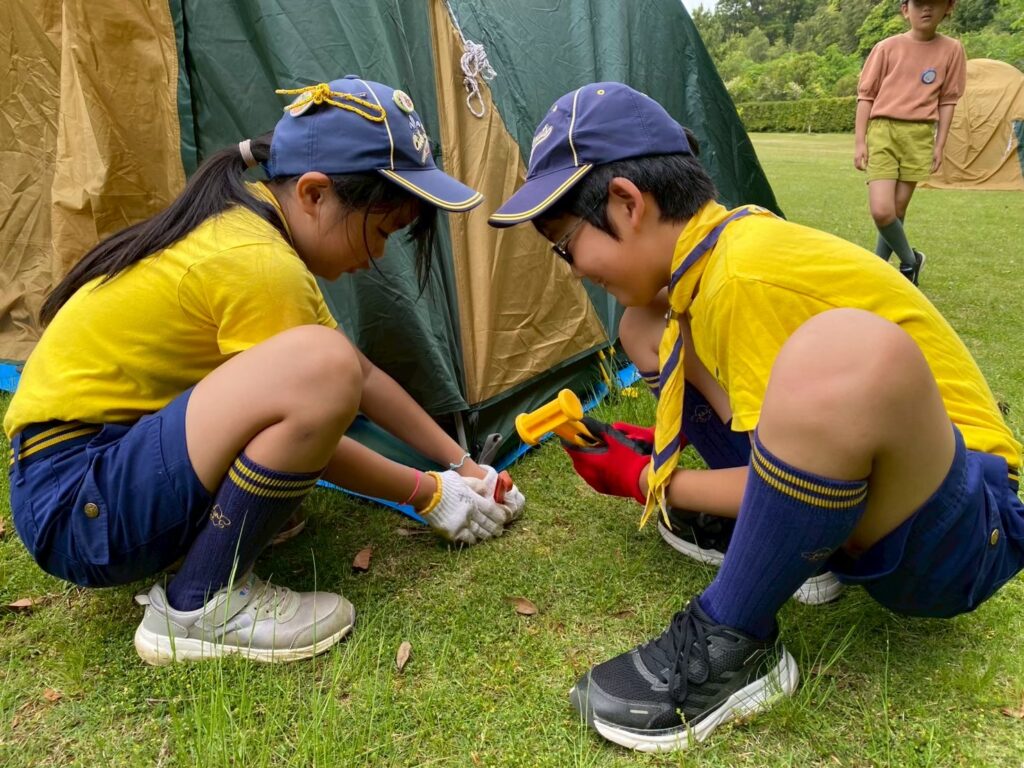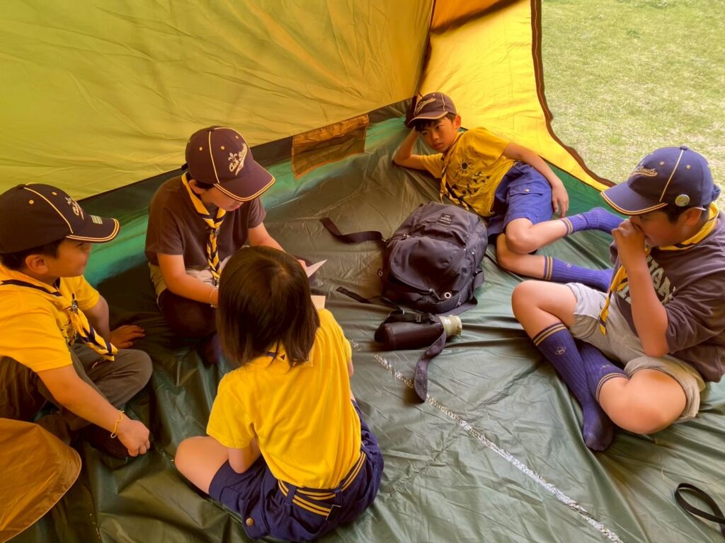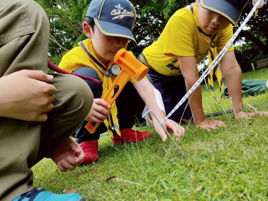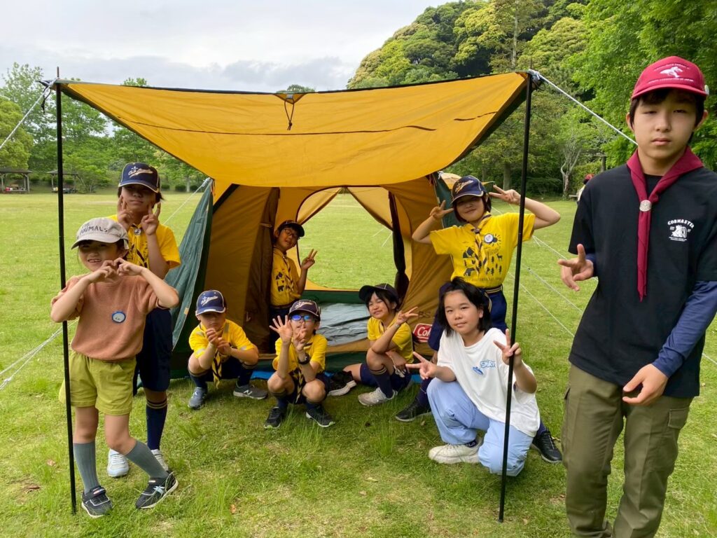 入隊式の後は、早速みんなで基地となるテントを設営しました。