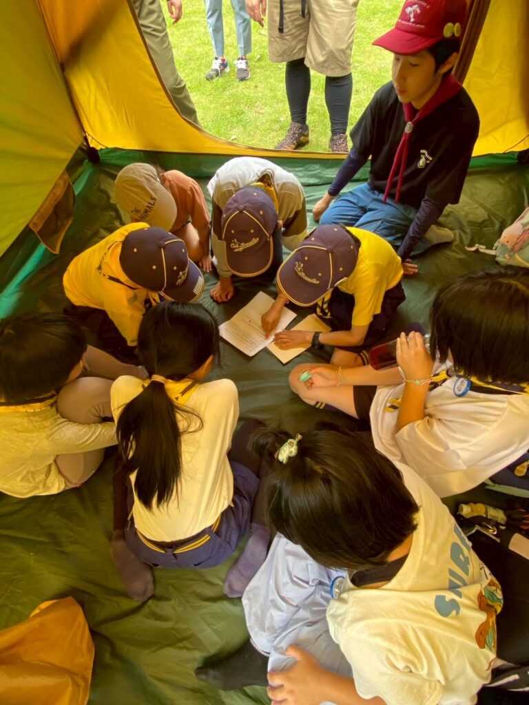早速、立てたテントの中で作戦会議!!みんなで協力して暗号を解読します。