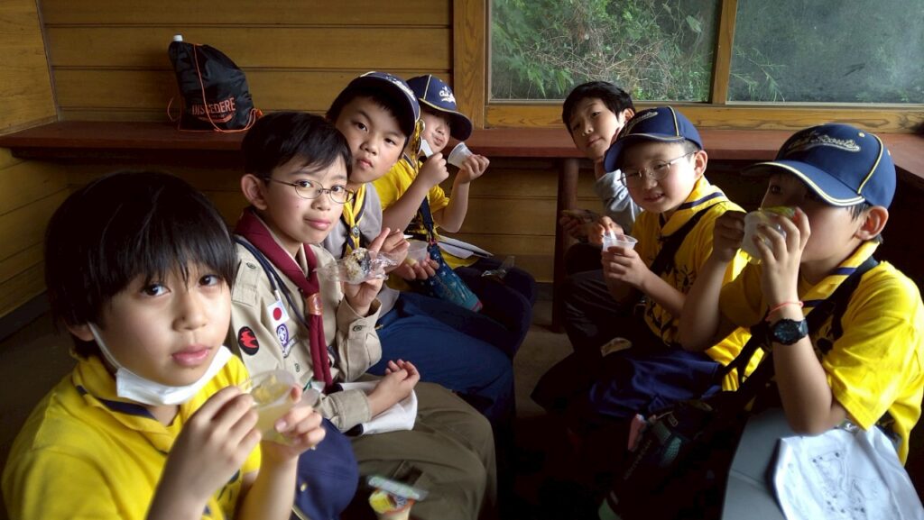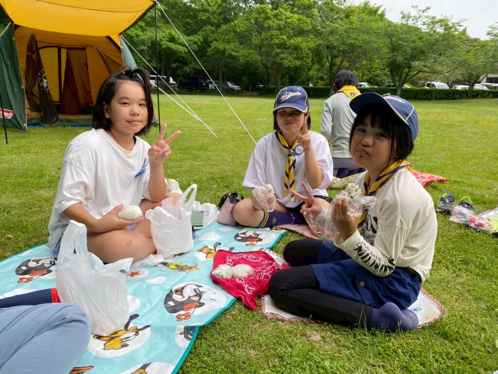 ゴールしたらみんなでお昼ごはん。カブスカウトのお弁当はカブ弁というおにぎり弁当です。