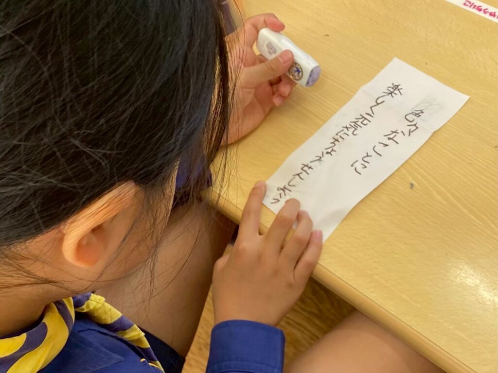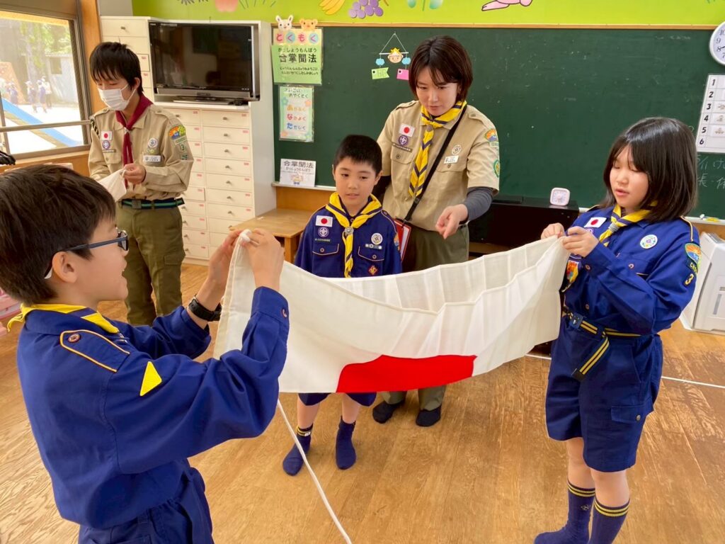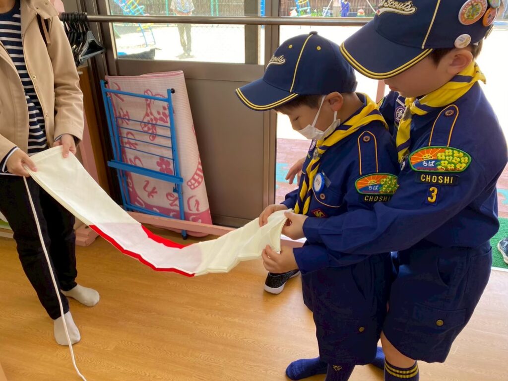 ゲームの後は、国旗のたたみ方や国旗掲揚・降納の練習をしたり、日の丸の意味について学びました。