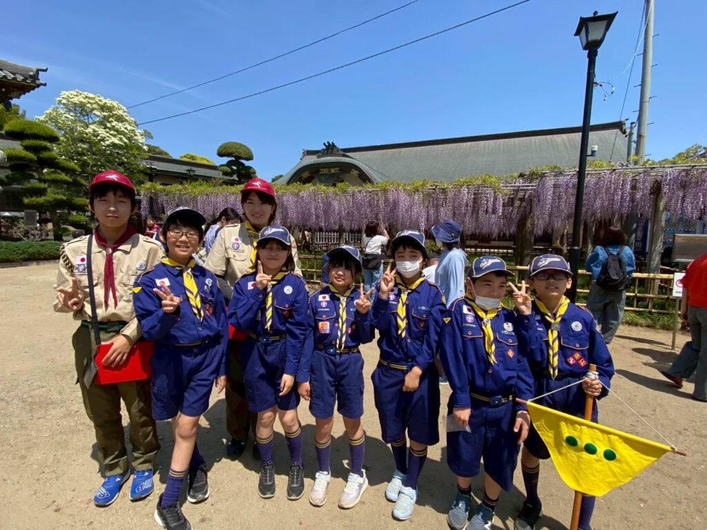 当日は気持ちのいい春の陽気で、藤の花がちょうど満開!スカウトたちも春の景色の中で元気にスタートを切りました。