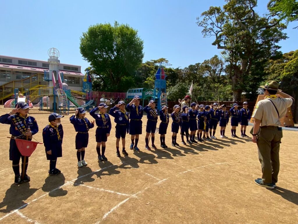 この日は、新しく入隊したうさぎスカウトたちにとって初めての活動なので、始めに整列や敬礼などの基本動作を学びました。